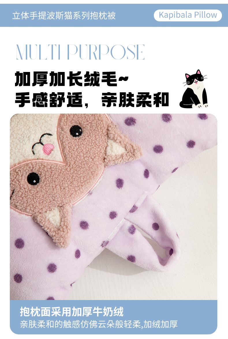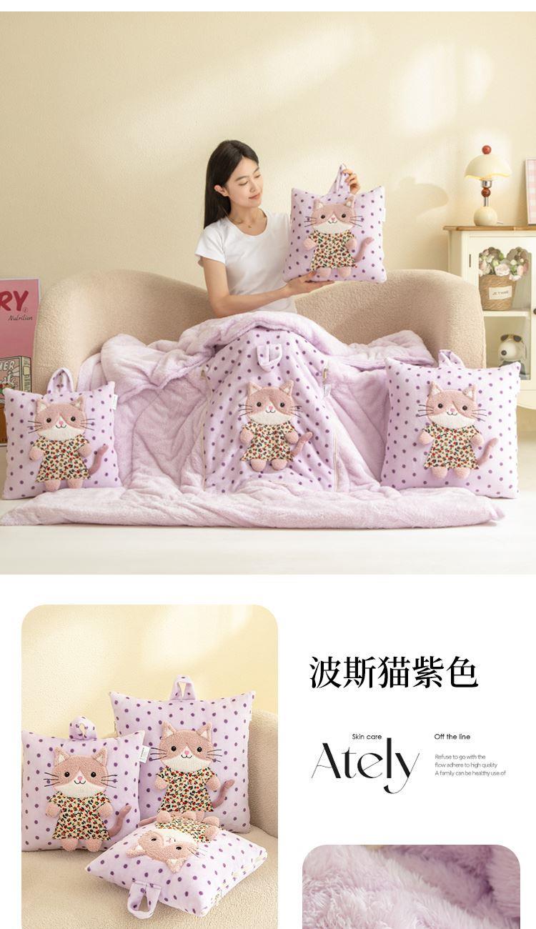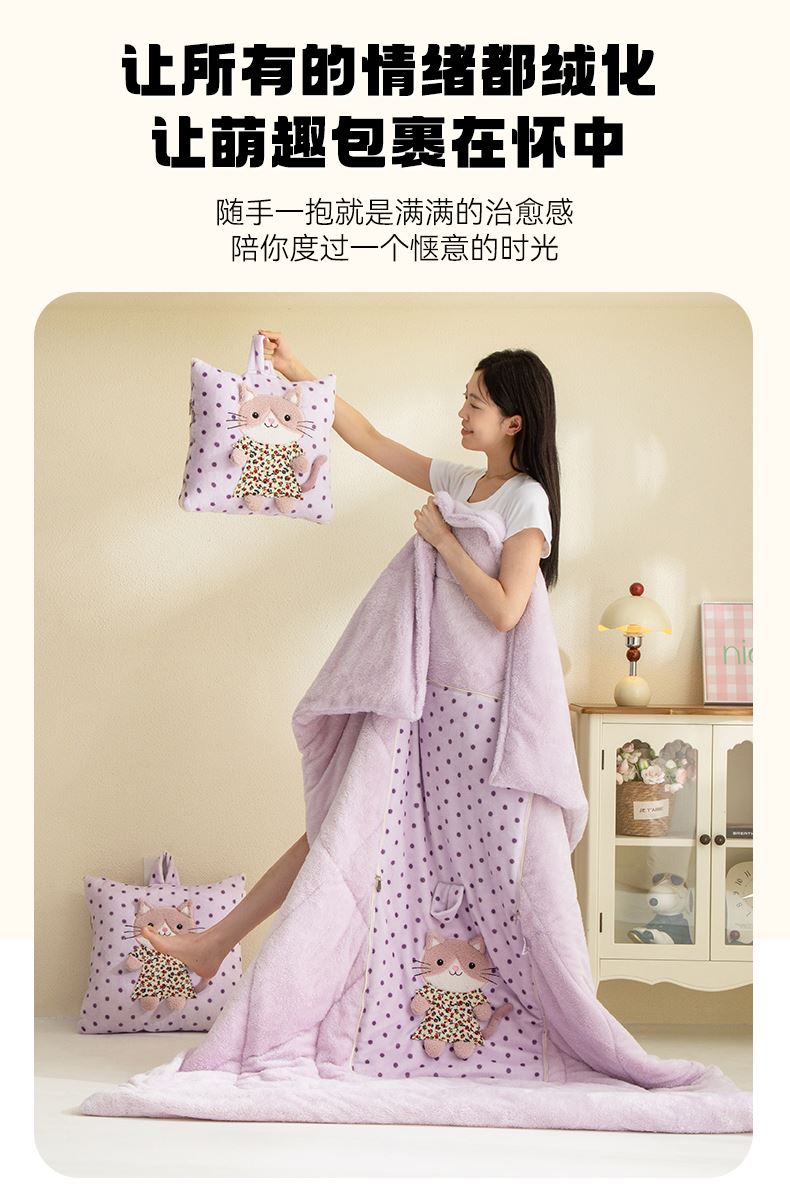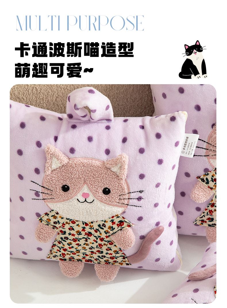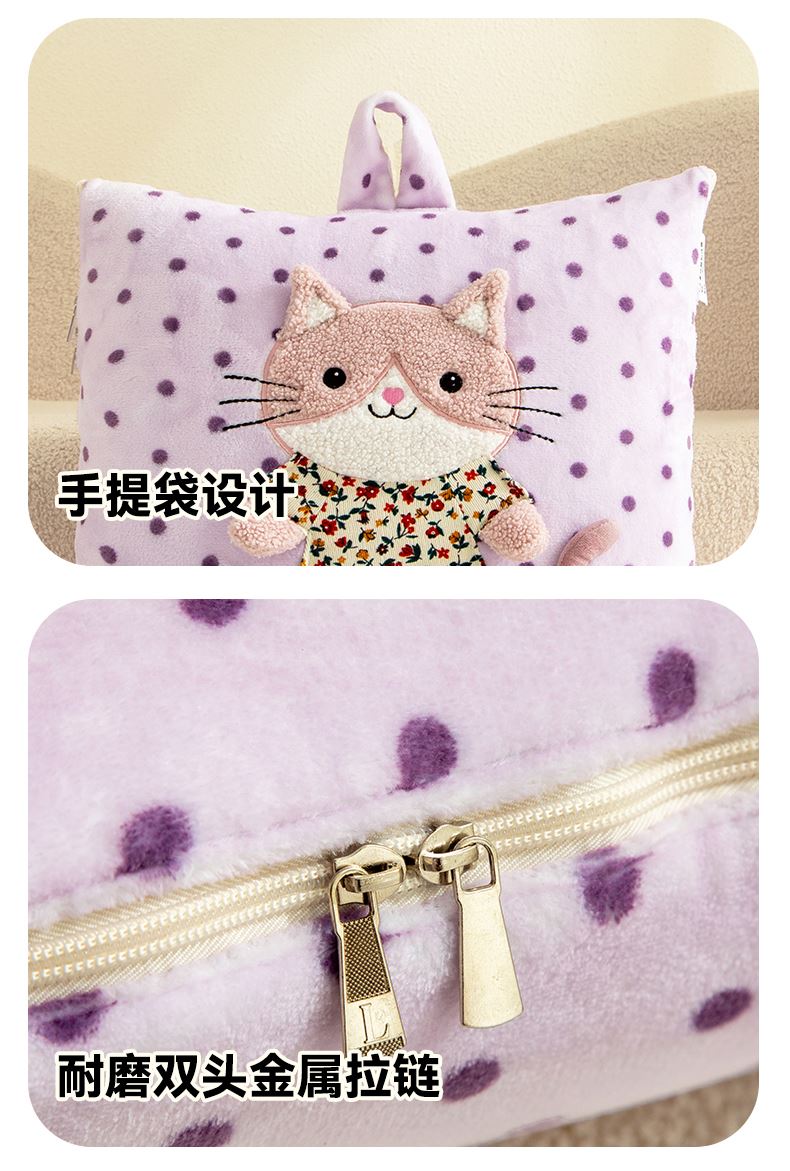 規(guī)格:40*40cm打開(kāi)被子110*150cm 面料:聚酯纖維 花色:波斯貓粉色、波斯貓藍(lán)色、波斯貓紫色 加厚柔軟保暖,順滑貼膚,隱型式拉鏈,采用整張水晶絨蓋毯,蓬松輕盈,包邊工藝更加耐用,立體公仔設(shè)計(jì),色彩靚麗,多種場(chǎng)合適用,車(chē)載客廳辦公均可,收納方便,不占地方。