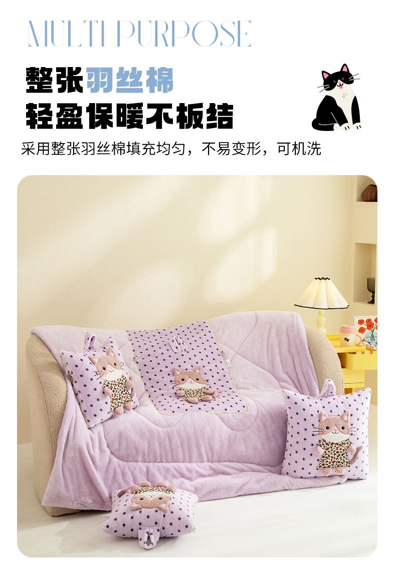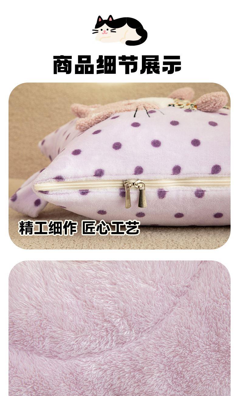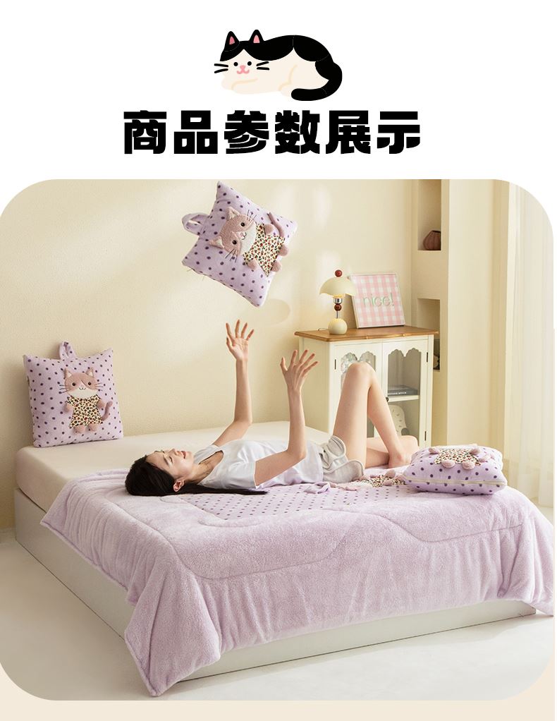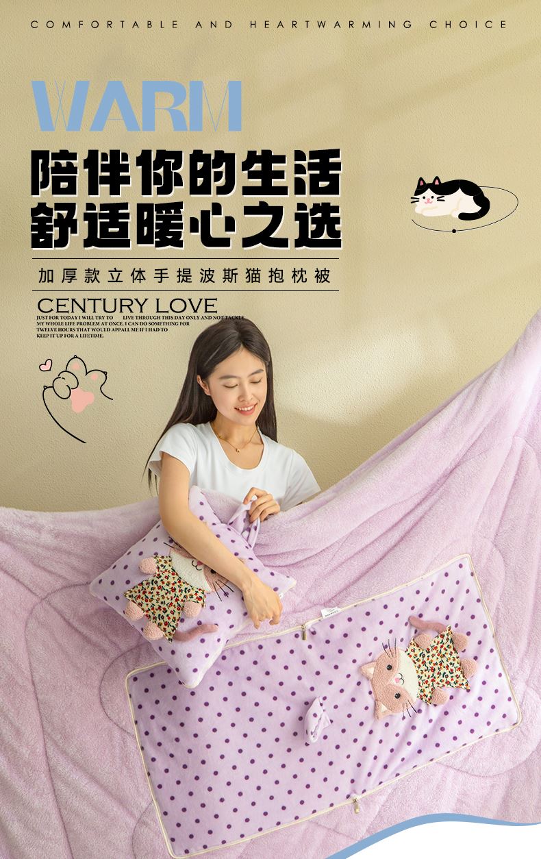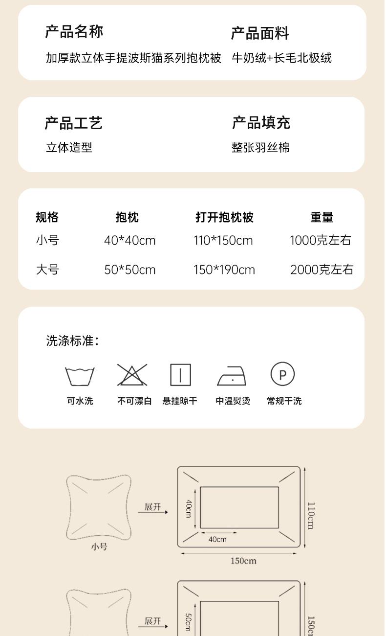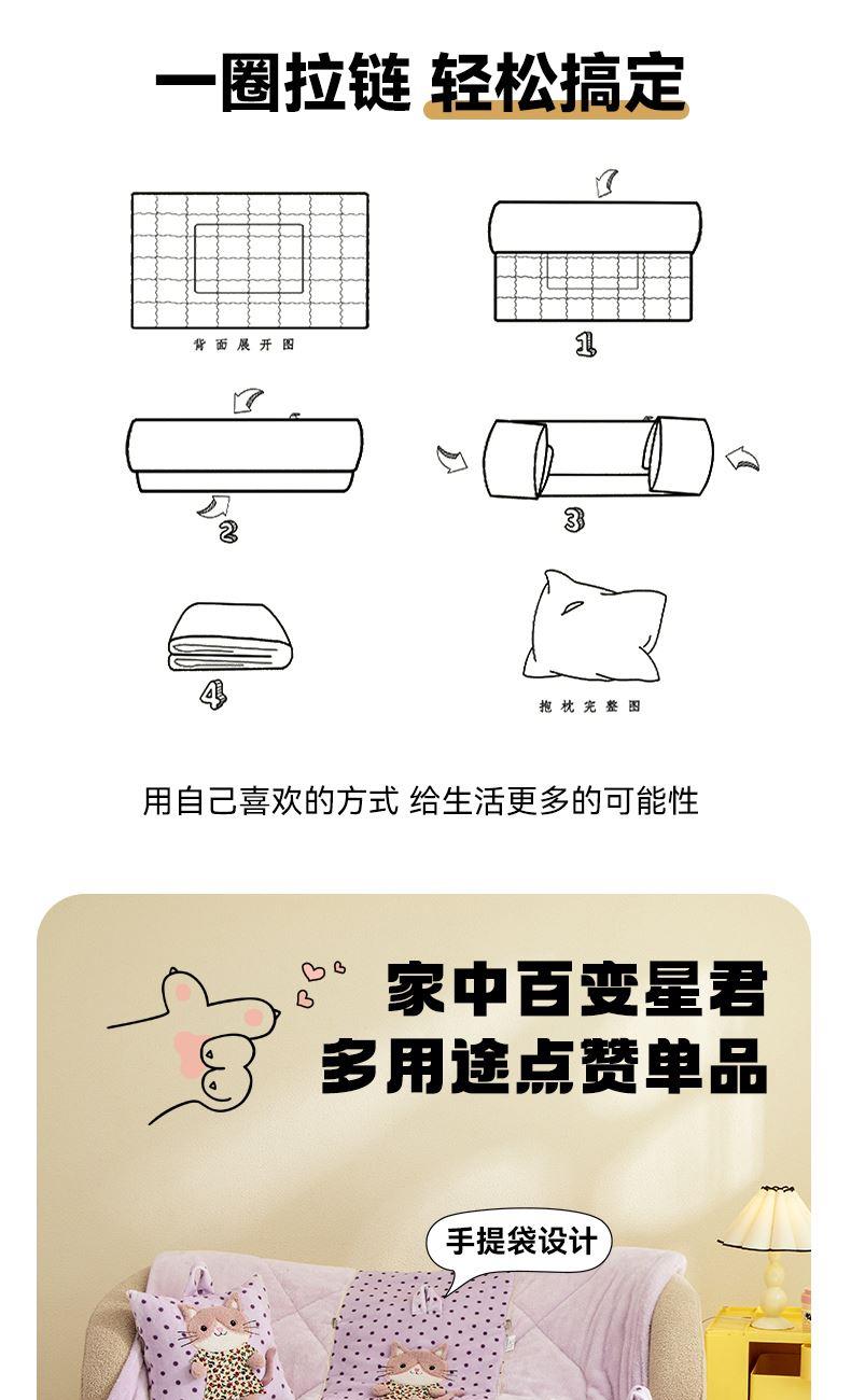 規(guī)格:40*40cm打開(kāi)被子110*150cm 面料:聚酯纖維 花色:波斯貓粉色、波斯貓藍(lán)色、波斯貓紫色 加厚柔軟保暖,順滑貼膚,隱型式拉鏈,采用整張水晶絨蓋毯,蓬松輕盈,包邊工藝更加耐用,立體公仔設(shè)計(jì),色彩靚麗,多種場(chǎng)合適用,車(chē)載客廳辦公均可,收納方便,不占地方。